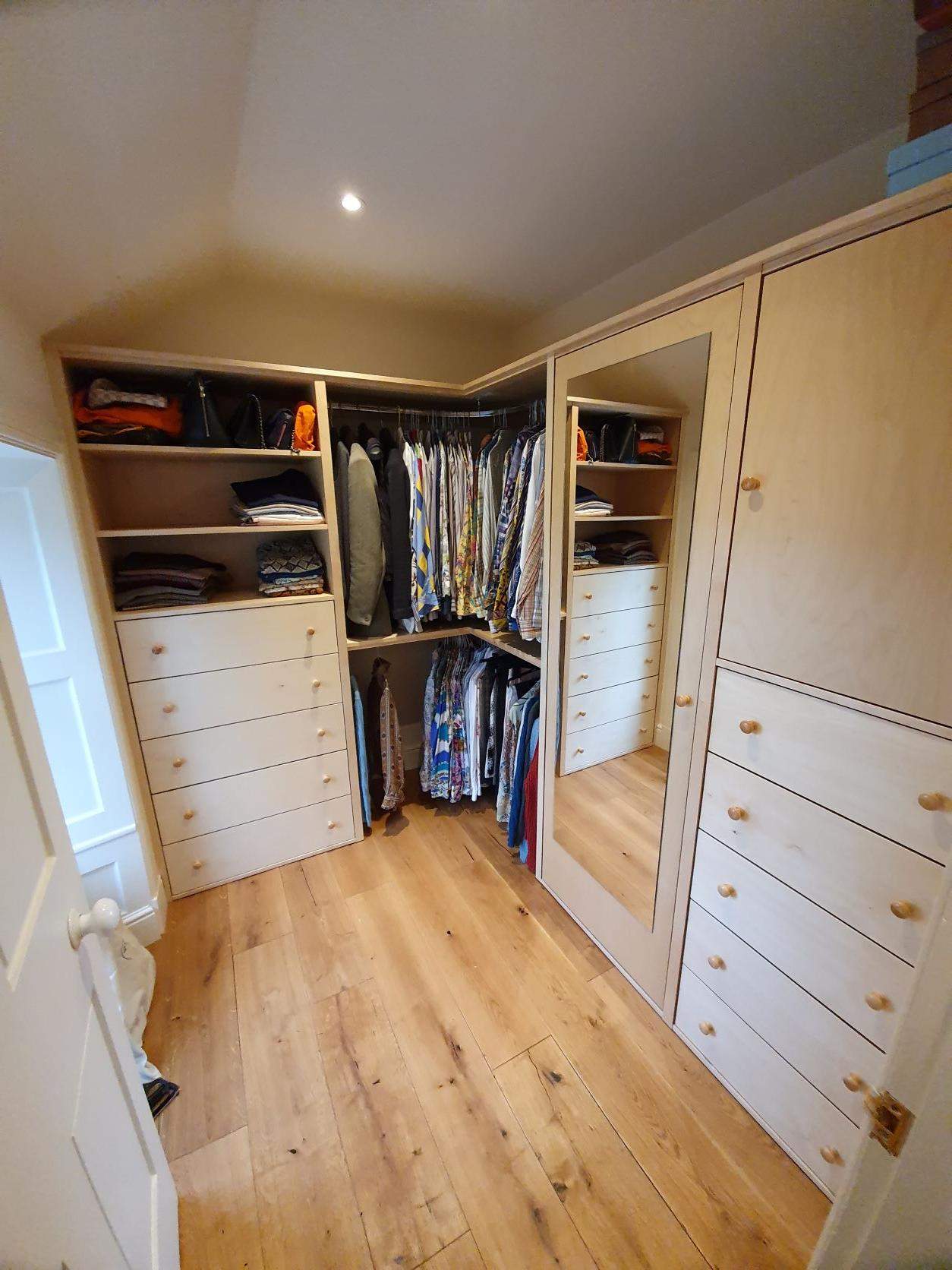Birch finish dressing room situated within a small room, adjacent to main bedroom, consisting of drawer units, wardrobe & storage space.